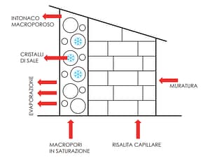 Gli attuali intonaci “risananti deumidificanti antisale macroporosi” presenti sul mercato , lavorano espellendo vapore ed immagazzinando i cristalli di sale provenienti dalla risalita capillare nei macropori interni, una volta che gli stessi vanno in saturazione, l’intonaco si spacca ed i problemi ricominciano.